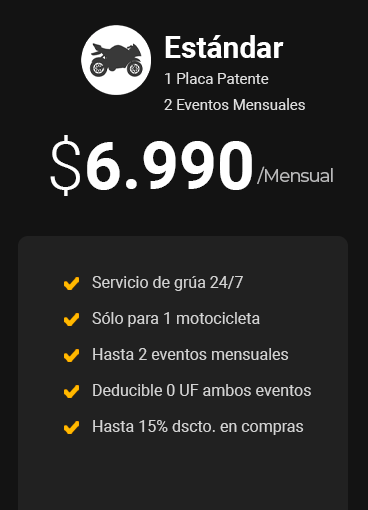 ![]() | El Plan Estándar es la elección ideal para amantes de las motocicletas que buscan asistencia confiable y asequible. Ofrece un servicio de grúa disponible 24/7, diseñado para una única motocicleta. Incluye la cobertura de hasta 2 eventos mensuales sin costo adicional y no tiene deducible (0 UF), lo que significa gastos cero en caso de necesitar asistencia. Además, disfrutarás de un 15% de descuento en tus compras. ¡Con el Plan Estándar, tu tranquilidad sobre dos ruedas está garantizada! |