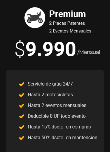 ![]() | El Plan Premium representa la excelencia en asistencia para los amantes de las motocicletas. Es un servicio de categoría superior diseñado para brindar una atención sin igual a quienes valoran la fiabilidad y calidad en cada trayecto. Este plan ofrece un servicio de grúa disponible las 24 horas del día, los 7 días de la semana, y está especialmente configurado para atender hasta dos motocicletas. Además, incluye la cobertura de hasta 2 eventos mensuales en total, asegurando que contarás con apoyo inmediato en situaciones de emergencia. Además contarás con descuentos de hasta un 15% en todas tus compras. Pero eso no es todo. Con el Plan Premium, disfrutarás de un increíble descuento de hasta el 50% en las mantenciones programadas. Esto significa un ahorro significativo en el mantenimiento regular de tus motocicletas, garantizando que siempre estén en óptimas condiciones. Optar por el Plan Premium significa elegir la más alta calidad y confiabilidad en asistencia para tus motos. Ya sea una pequeña avería o una situación más compleja, estamos aquí para cuidar de tus pasiones sobre dos ruedas con el nivel de servicio que te mereces. |
